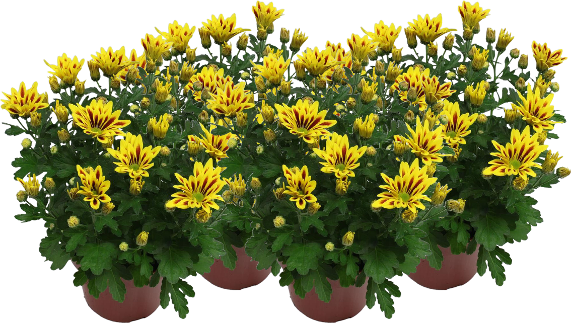 Les chrysanthèmes 'Rainbow Lake Worth' séduisent par leur combinaison lumineuse de jaune et de rouge ainsi que leur floraison généreuse. Buissonnants, robustes, faciles d’entretien et adaptés à la coupe, ils sont faits pour les massifs, balcons ou pots. Un vrai point de mire pour les décorations automnales.
