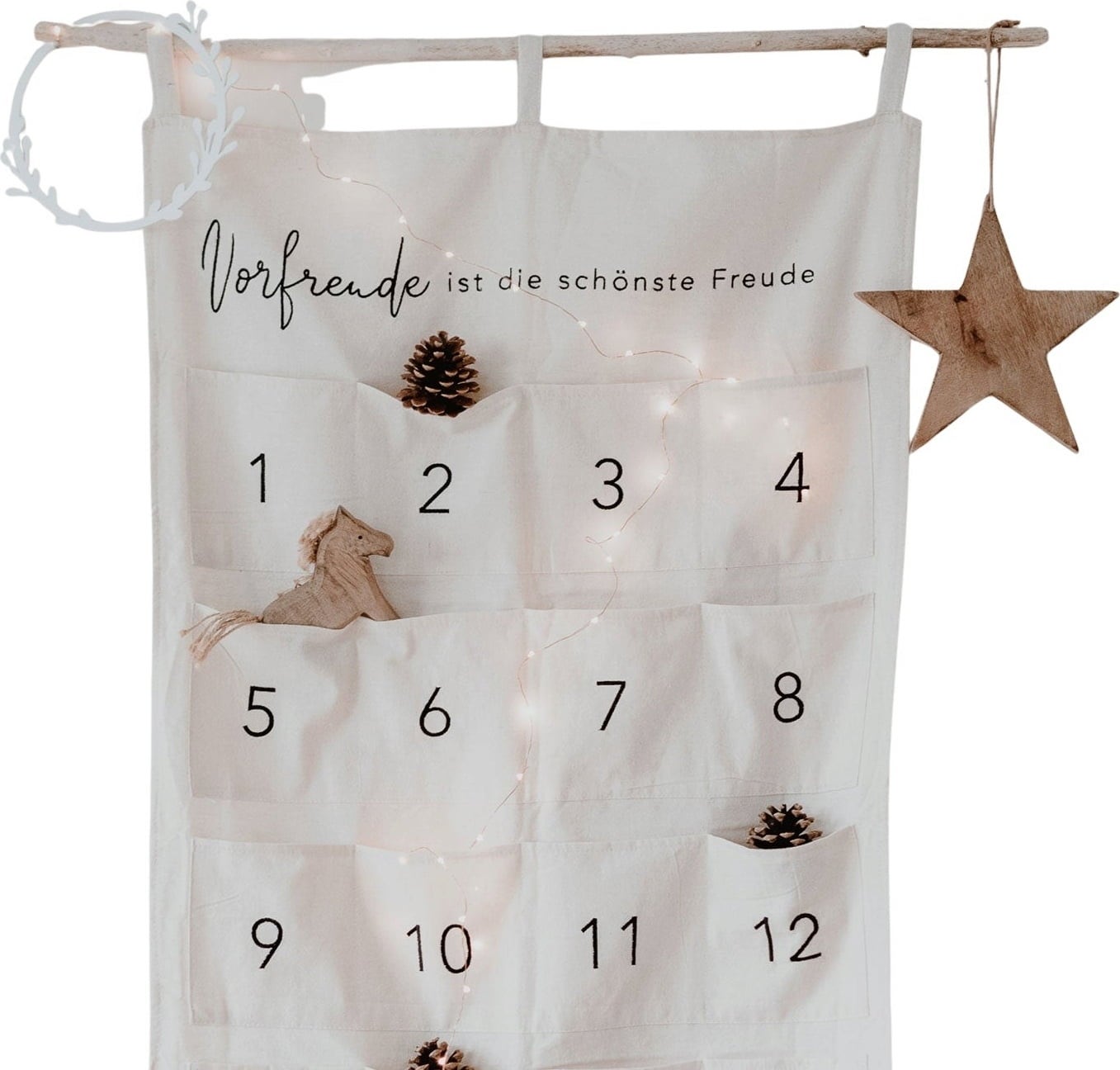 Contenu : Calendrier de l’Avent à remplir soi-même (la décoration, la guirlande lumineuse, les ornements et la branche ne sont pas inclus)