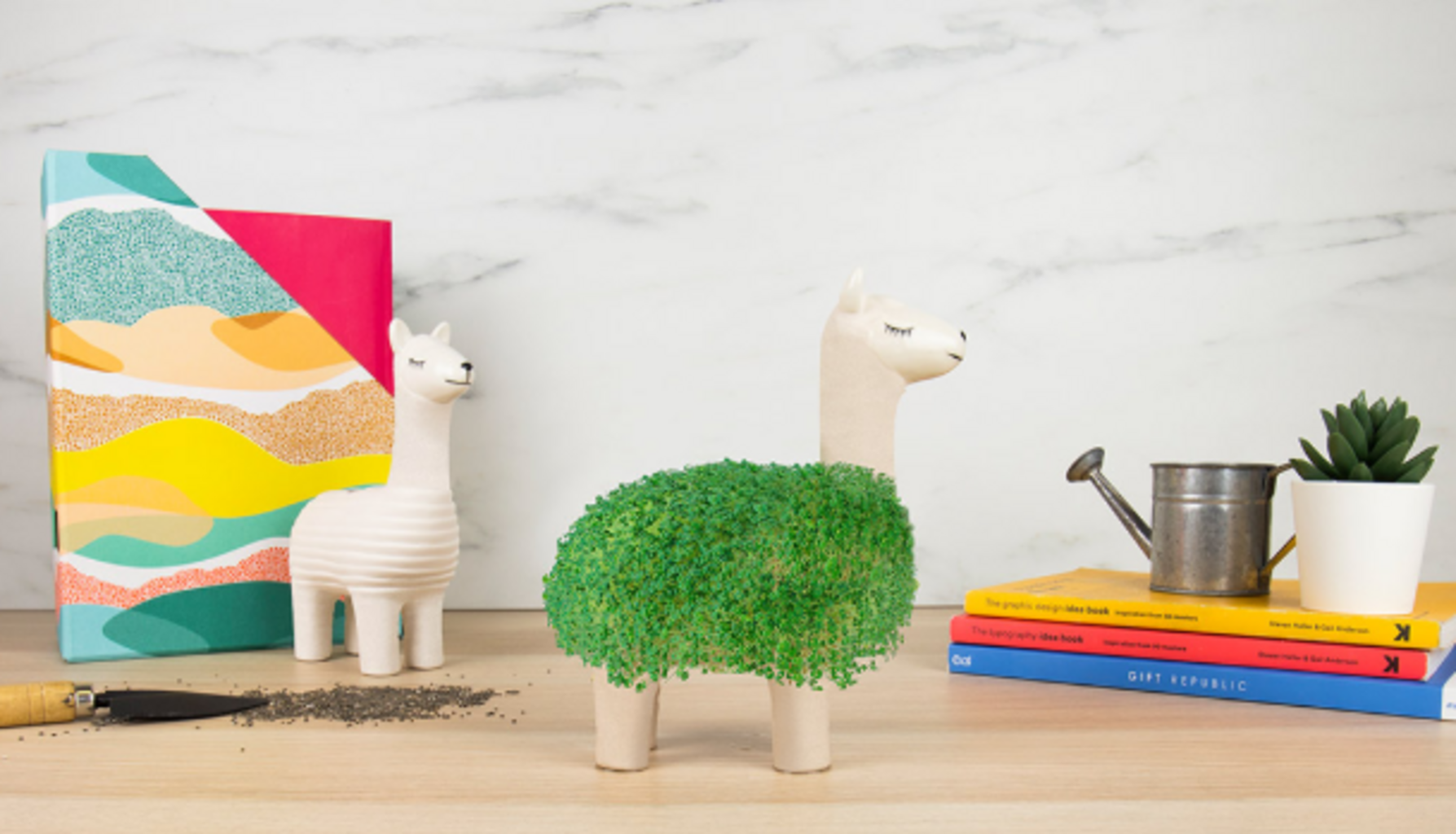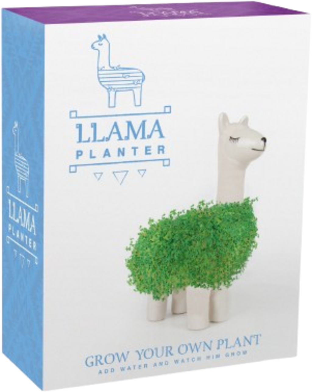 Ce charmant lama n’attend que d’être saupoudré avec les graines de chia incluses puis arrosé. Profitez de son pelage vert qui pousse progressivement.