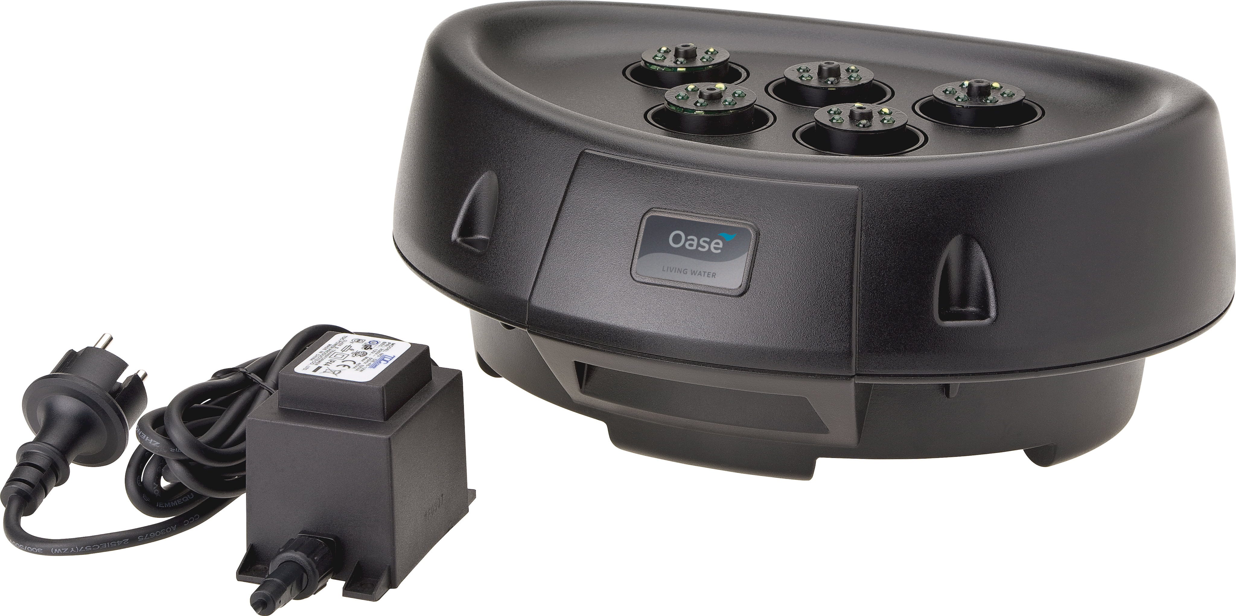 Grâce aux cinq buses intégrées, différentes fontaines s’élèvent jusqu’à 70 centimètres de hauteur et sont parfaitement mises en valeur par des anneaux LED blanc chaud. En optant pour une technologie 12 volts à la fois sûre et économe en énergie, Oase permet une utilisation en toute tranquillité, y compris dans un bassin de baignade.