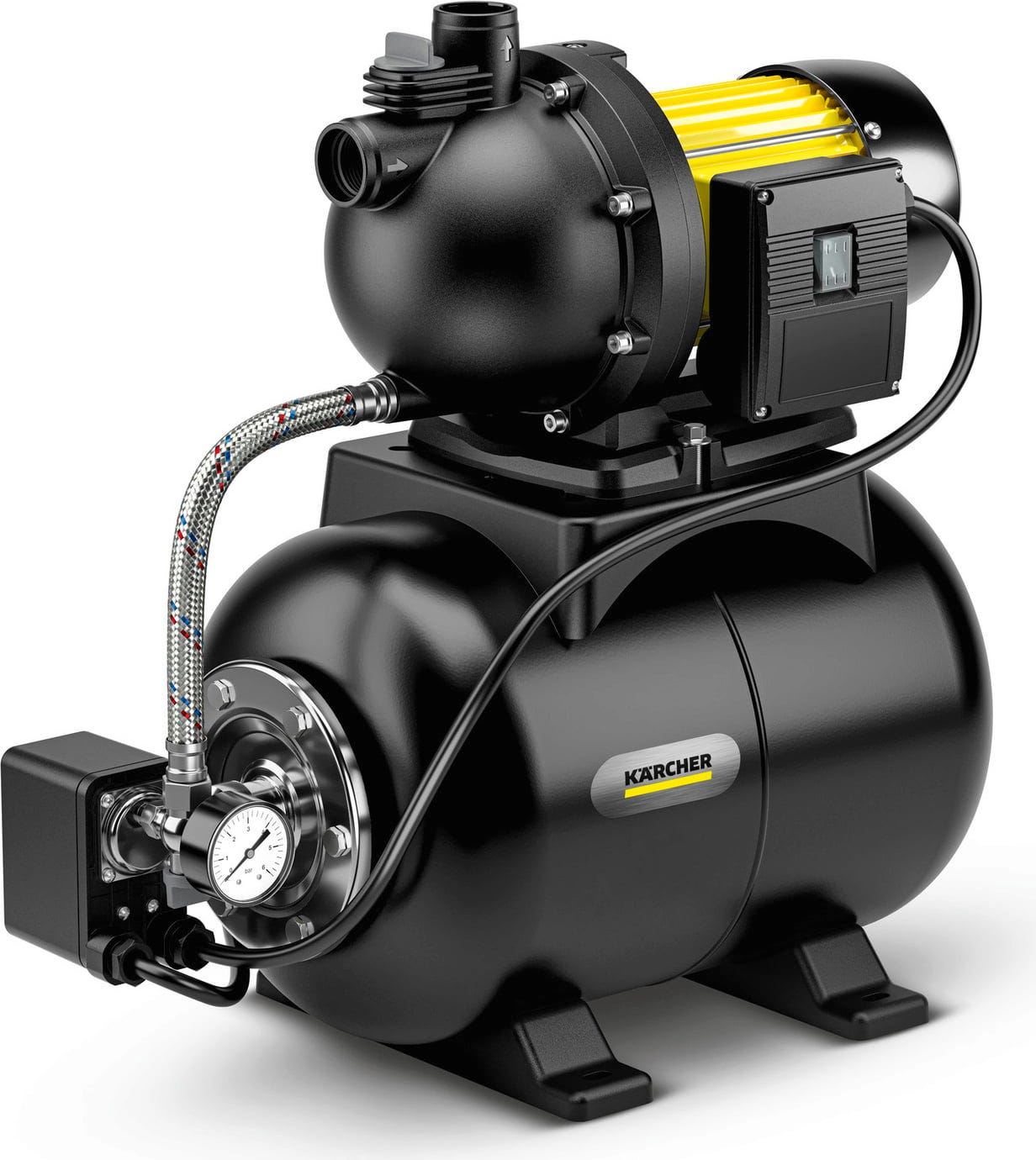 Le réservoir sous pression intégré avec un volume de 19 litres assure une pression constante dans le système d'eau domestique et réduit la fréquence de redémarrage de la pompe. L'activation et la désactivation automatiques se font en fonction des besoins via le système intégré, ce qui permet d'utiliser confortablement le surpresseur pour machine à laver ou comme surpresseur pour chasse d'eau au quotidien. Avec une hauteur d'aspiration de 8 m, l'eau peut être pompée de manière fiable depuis des puits ou des citernes. Des composants tels que la bride en acier inoxydable et l'arbre moteur garantissent une construction robuste et durable.