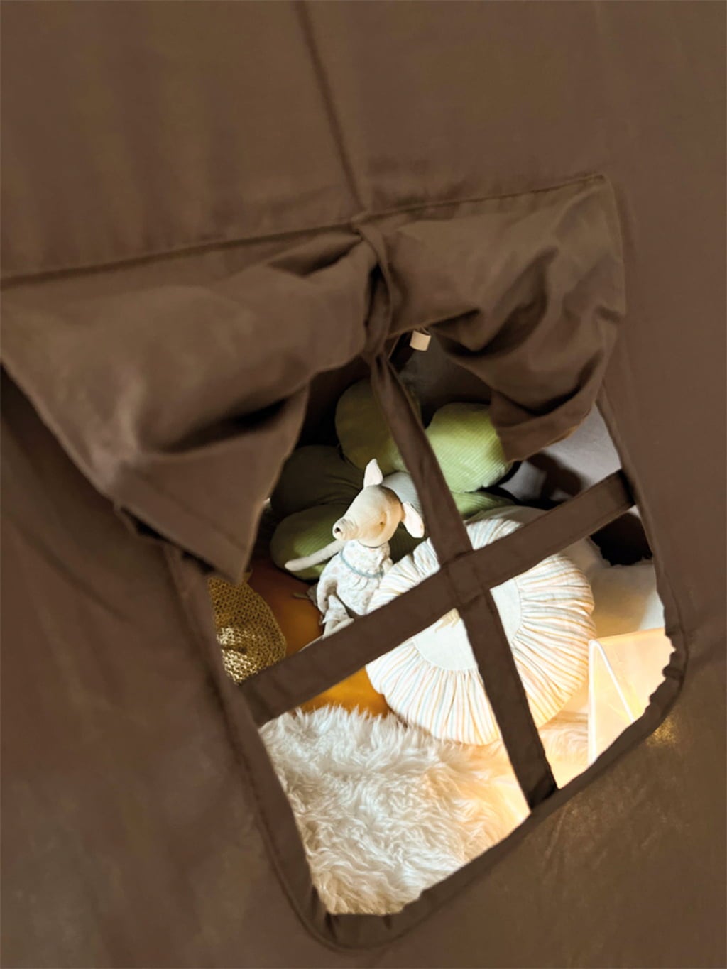 Un refuge enchanteur pour les petits explorateurs, idéal pour vivre de grandes aventures, profiter de moments de lecture au calme ou passer des instants câlins. Cette tente d'intérieur moderne, fabriquée en bois robuste et en tissu doux, offre un espace intérieur généreux et crée une atmosphère chaleureuse propice au jeu, au repos et à l'imaginaire. Dotée d'une fenêtre pratique pour observer l'extérieur et d'une ouverture enroulable à fixer à l'aide de rubans, elle deviendra vite le coin préféré de la chambre. Sa teinte taupe discrète et tendance invite à la sérénité : parfaite pour les jeux de rôle créatifs et les moments de détente tout en douceur.